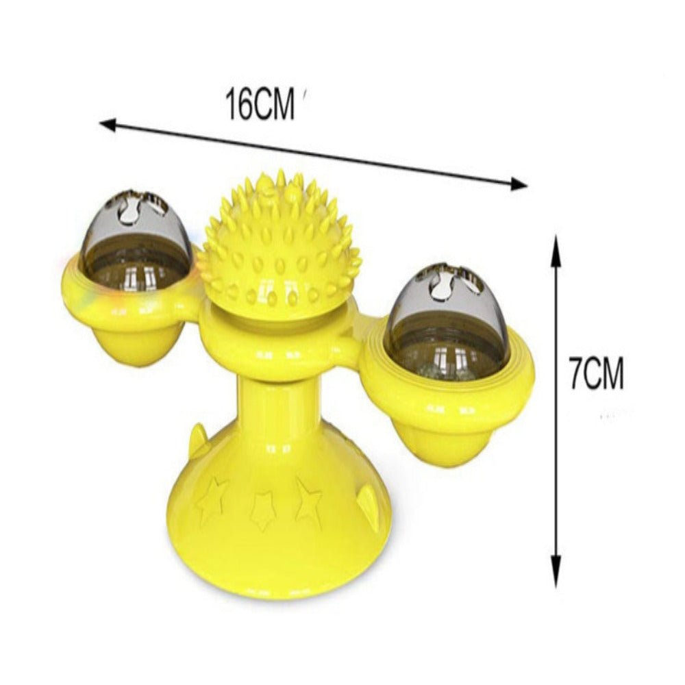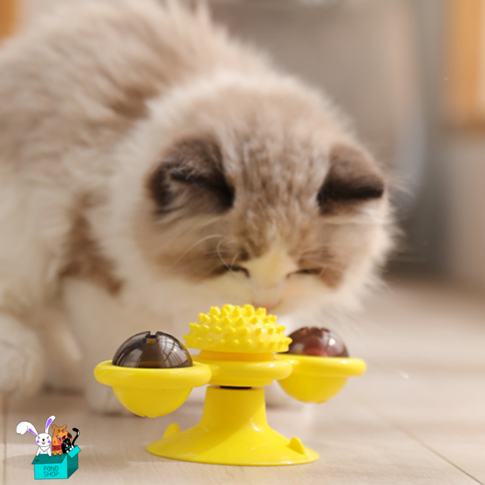 Interativo: O brinquedo possui um formato redondo, é giratório e está disponível nas cores amarelo, verde e azul. Ao simples toque do seu gato neste brinquedo, ele começará a girar, chamando a atenção do animal.